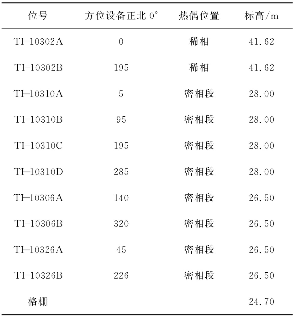 位号方位设备正北0°热偶位置标高/mTI-10302A0稀相41.62TI-10302B195稀相41.62TI-10310A5密相段28.00TI-10310B95密相段28.00TI-10310C195密相段28.00TI-10310D285密相段28.00TI-10306A140密相段26.50TI-10306B320密相段26.50TI-10326A45密相段26.50TI-10326B226密相段26.50格栅24.70