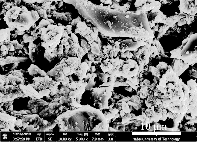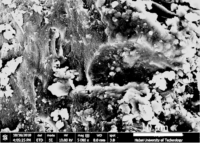 细颗粒的堆密度低、水润湿性差,水对土壤尘的聚集效果且有可逆性,干燥之后基本复原。图4为土壤尘团聚体表面形貌的SEM图像。图4a中,洒水土壤尘的颗粒堆积松散、空隙可见,内聚力低。