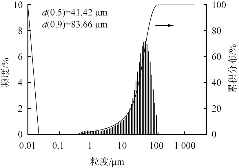 以吸尘器采集裸土操场的表面积尘,去除杂物后105 ℃烘干至恒重。 180 μm(80目)筛下粒级用于实验。 扬尘的主要粒级是PM10[7],即粒径为75 μm以下的土壤粉粒(silt)。 按照美国环保局AP-42方法,测得土壤尘的粉粒的质量分数为23.5%。25 ℃下采用Mastersizer 2000激光粒度仪(英国Malvern公司)测定粉粒的粒径分布,图1为土壤粉粒的粒径分布图,中值粒径为41.42 μm。以ARL QUANT型X射线荧光光谱仪(美国Thermo Fisher Scientific公司)测得土壤粉粒的化学组成,结果见表1。