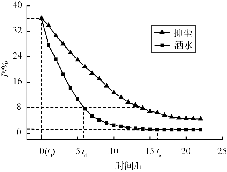 研究表明[8],不低于无扬尘含水率(dust extinction moisture,DEM)时,扬尘量微乎其微。在干旱和半干旱地区,风速为12 m/s时砂质壤土的DEM为4%~6%,即含水率高于此临界值时PM10的排放量可以忽略。土壤砂粒DEM为2%~5%,粉粒DEM为5%~10%[10],因此,本文中以8.0%为DEM,据此判定抑尘时间td。 图5中,洒水的抑尘时间为5.83 h,喷洒抑尘剂则达到13.9 h,提高了1.38倍。由此可见,聚合物促进土壤尘颗粒有序化聚集、阻塞水传输,延长了抑尘时间。