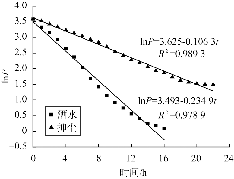 式中:A、B为常数,方程(3)取自然对数,其回归结果见图6。由式(4)可知,从td至te时刻,洒水土壤尘的平均含水率为3.18%,抑尘样品则为5.74%。