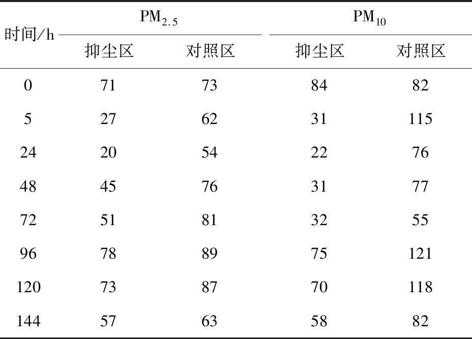 时间/hPM2.5抑尘区对照区PM10抑尘区对照区07173848252762311152420542276484576317772518132559678897512112073877011814457635882