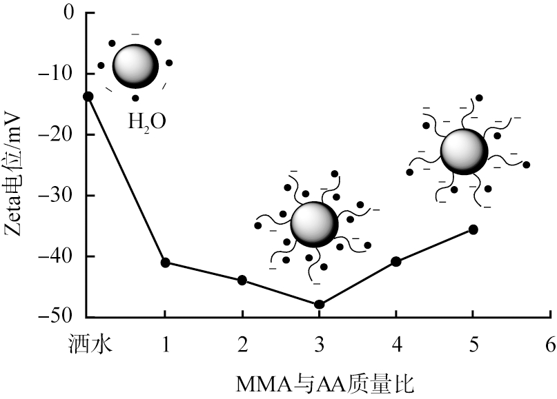 MMA与AA质量比增大,聚合物的羧基含量降低。在土壤尘化学吸附能力一定的情况下,增加MMA与AA质量比有助于提高吸附量,因而Zeta负电位缓慢增加,当质量比为3时Zeta电位达到-47.9 mV。继续增加质量比,羧基含量进一步降低,土壤尘的吸附量和水化层厚度下降,Zeta电位反而降低,因此,选择AA用量质量分数为2.0%、MMA与AA的质量比为3的聚合物继续下面的工作。