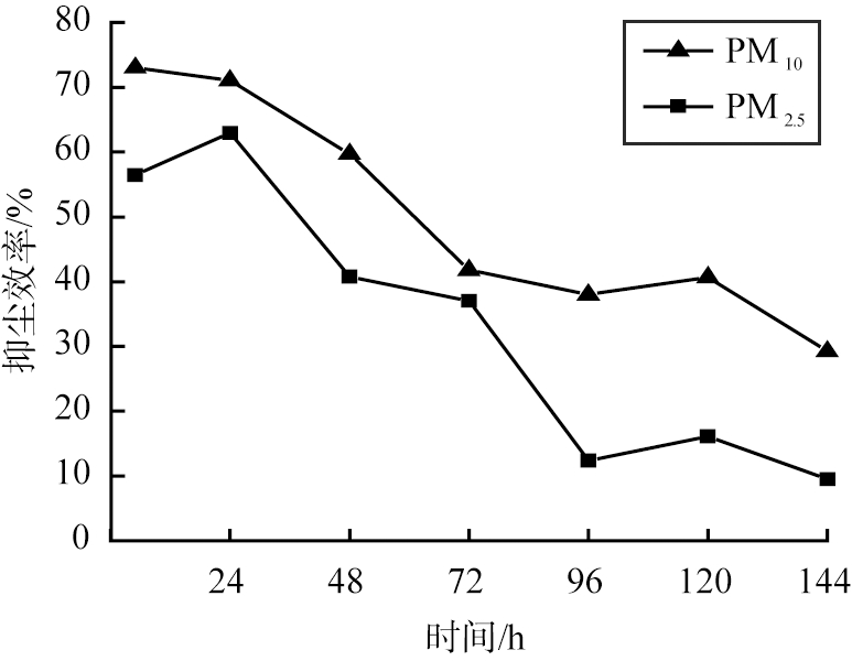 此后数日,操场未作洒水防护,当地无降雨,风力不足3级。受城区颗粒物扩散的影响,120 h的PM2.5和PM10抑尘效率分别降低至16.09%和40.68%。至此,6 d累计PM2.5和PM10的平均抑尘效率分别为33.6%和50.52%。