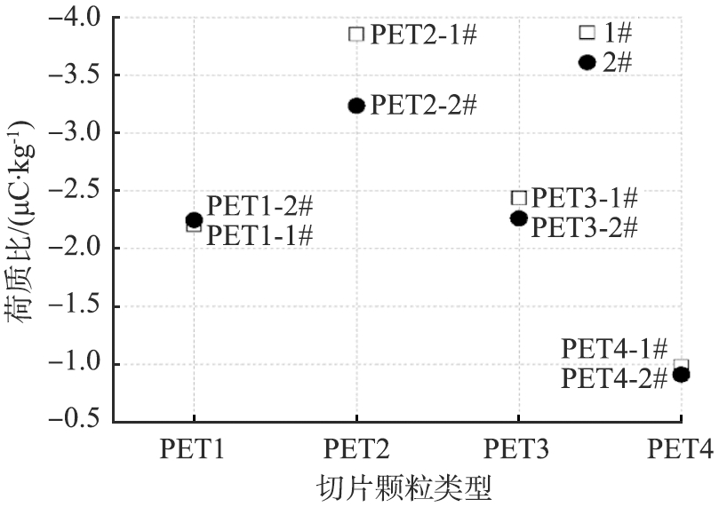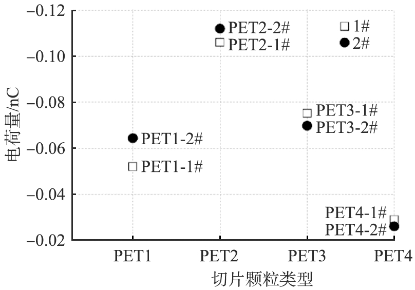 图6b为根据颗粒质量计算不同PET颗粒的荷质比。由图可以看出,基础切片在预结晶处理后,切片带电量增加;随着切片固相缩聚处理,切片荷质比减小,但荷质比值可以超过-1 μC·kg-1。