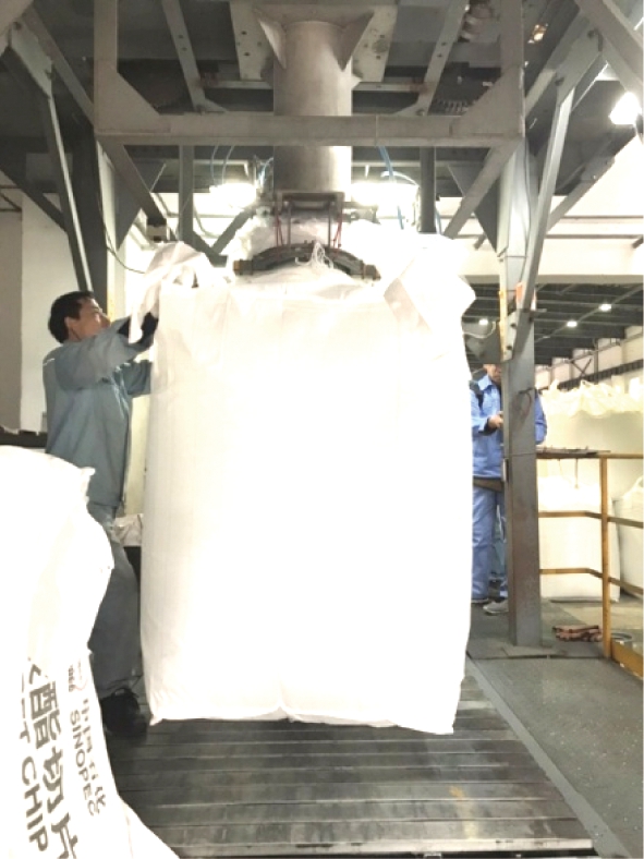 图7为某瓶级聚酯切片吨袋包装作业现场照片。利用EFM-022静电场测试仪(0 kV~±200 kV),测试切片下料包装过程中及料袋在堆垛1 h后料袋表面电位,测试环境温度为22.5~24.3 ℃,相对湿度为39.3%~45.7%。