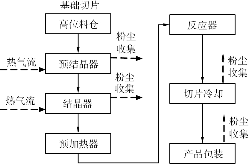 固相缩聚工艺是将未结晶的PET基础切片(PET1)颗粒先后经升温预结晶、结晶、加热缩聚反应和冷却处理,最终完成切片产品的包装[7,12-13]。图1为布勒工艺生产瓶级聚酯切片的工艺流程简图。基础切片经过风送管道输送到固相缩聚装置的高位料仓;高位料仓中的基础切片经旋转给料器连续定量的先后喂入预结晶器、结晶器、反应器等进行固相缩聚反应;固相缩聚处理过程中,切片先后被循环空气(氮气)流化、加热、结晶;最终结晶切片颗粒冷却后,经斜溜槽或管道进入包装机并完成产品的包装。在切片生产过程中,通过气流作用将固相缩聚装置内大颗粒切片与粉尘分离,去除切片中夹带的粉尘[7,14]。