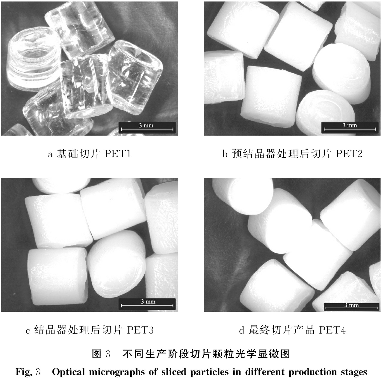 a 基础切片PET1b 预结晶器处理后切片PET2c 结晶器处理后切片PET3d 最终切片产品PET4图3 不同生产阶段切片颗粒光学显微图Fig.3 Optical micrographs of sliced particles in different production stages