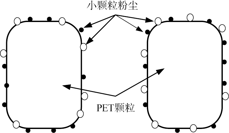 1)静电吸附细小粉尘。切片颗粒在固相缩聚反应过程摩擦带电,带电切片颗粒会因静电作用吸附粉尘。 图2为粉尘在静电作用下吸附在带电切片颗粒表面的示意图,切片颗粒对粉尘的静电吸附作用会导致固相缩聚装置和包装装置内除尘效果变差[9-10];另外,带电切片进入料袋导致料袋表面带电,带电料袋吸附空气中灰尘。
