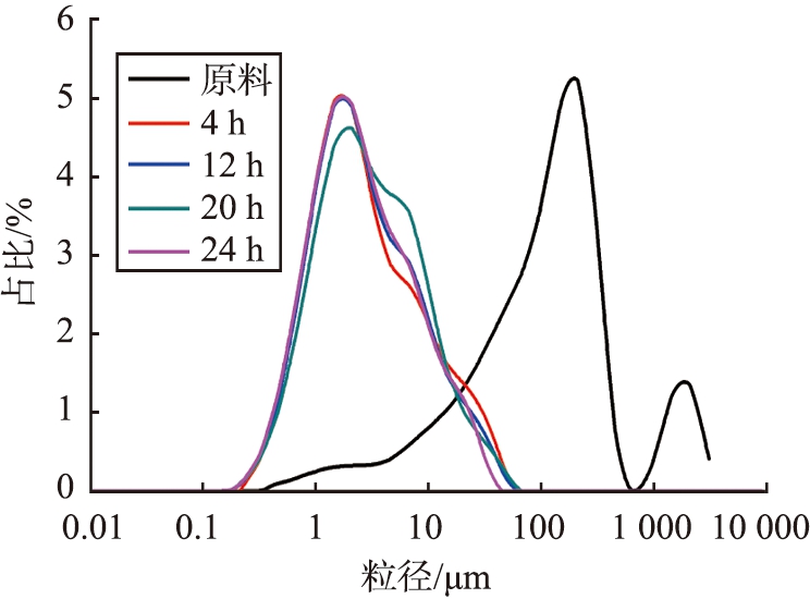 2)球磨时间对产物粒径分布具有明显影响, 延长球磨时间有利于降低大粒子在产物中的比例, 但4 h以上的球磨时间对小粒子影响不大, 存在“粉碎极限”效应。