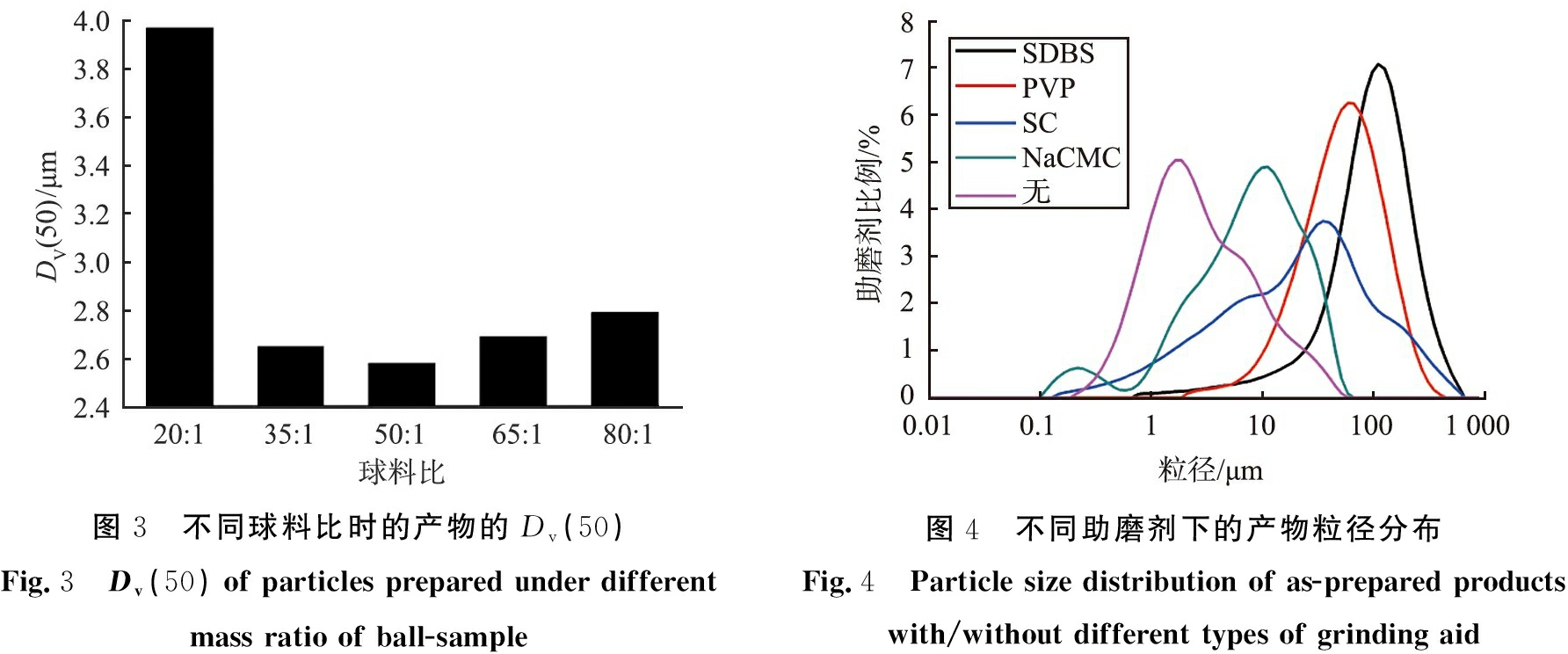 图3 不同球料比时的产物的Dv(50)Fig.3 Dv(50) of particles prepared under different mass ratio of ball-sample图4 不同助磨剂下的产物粒径分布Fig.4 Particle size distribution of as-prepared products with/without different types of grinding aid