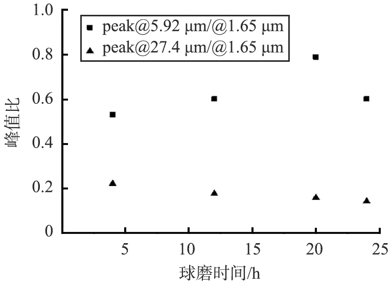 1.65~60.0 μm粒径范围部分,4个球磨时间对应的粒径分布曲线区别明显,该部分4条曲线均含有2个肩峰,分别位于5.92和27.4 μm处,这2个肩峰与主峰的峰值比和球磨时间的关系如图2所示。