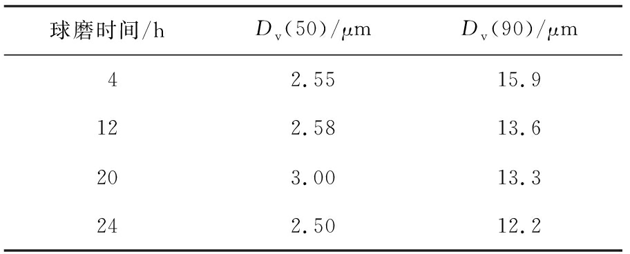 表1 不同球磨时间对应产物的Dv(50)和Dv(90)