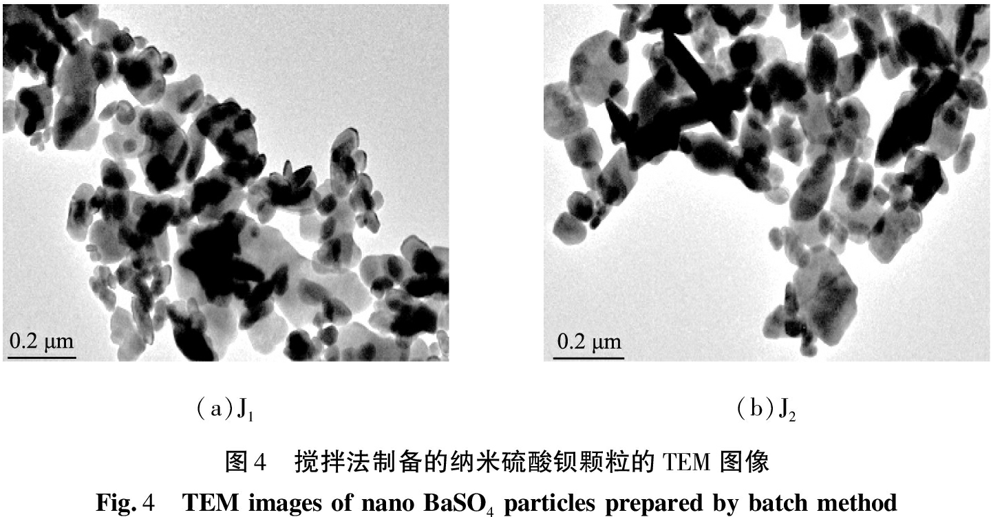 (a)J1(b)J2图4 搅拌法制备的纳米硫酸钡颗粒的TEM图像Fig.4 TEMimagesofnanoBaSO4particlespreparedbybatchmethod
