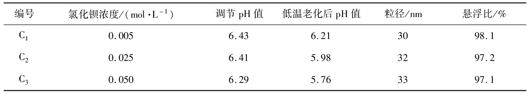 编号氯化钡浓度/(mol·L-1)调节pH值低温老化后pH值粒径/nm悬浮比/%C10.0056.436.213098.1C20.0256.415.983297.2C30.0506.295.763397.1