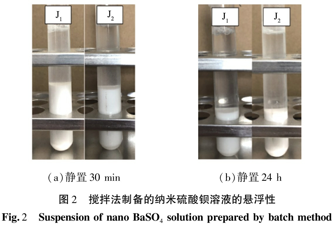 (a)静置30min(b)静置24h图2 搅拌法制备的纳米硫酸钡溶液的悬浮性Fig.2 SuspensionofnanoBaSO4solutionpreparedbybatchmethod