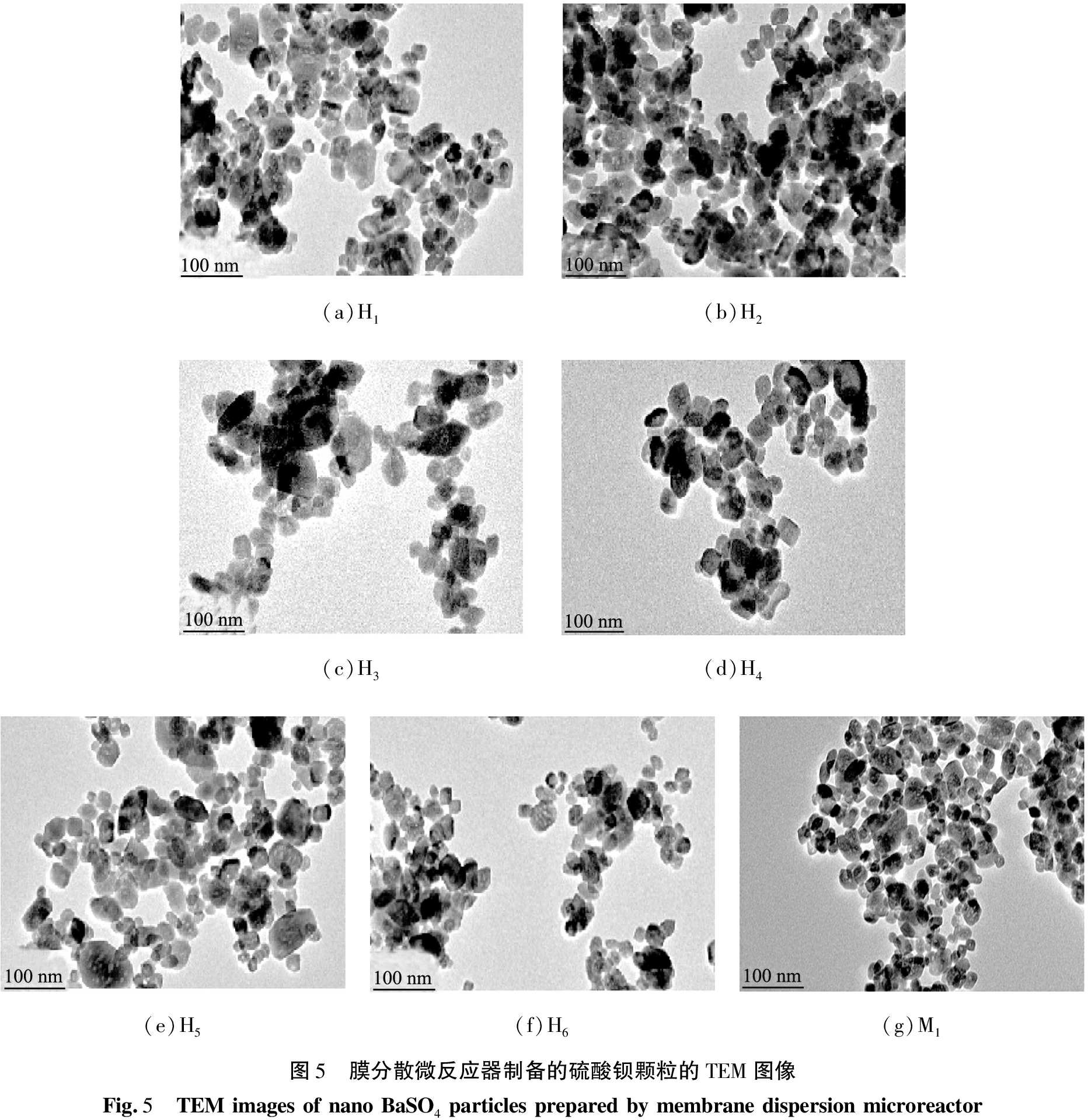 (a)H1(b)H2(c)H3(d)H4(e)H5(f)H6(g)M1图5 膜分散微反应器制备的硫酸钡颗粒的TEM图像Fig.5 TEMimagesofnanoBaSO4particlespreparedbymembranedispersionmicroreactor