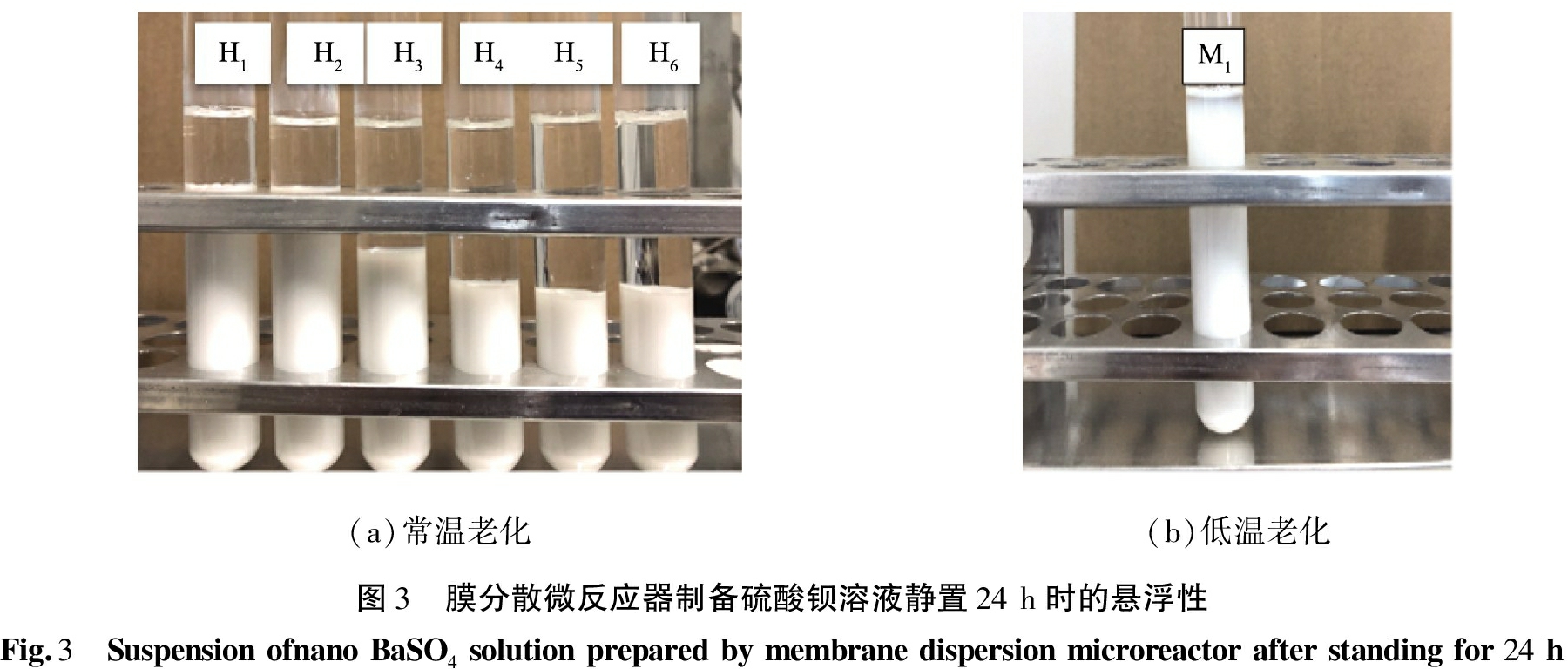 (a)常温老化(b)低温老化图3 膜分散微反应器制备硫酸钡溶液静置24h时的悬浮性Fig.3 SuspensionofnanoBaSO4solutionpreparedbymembranedispersionmicroreactorafterstandingfor24h
