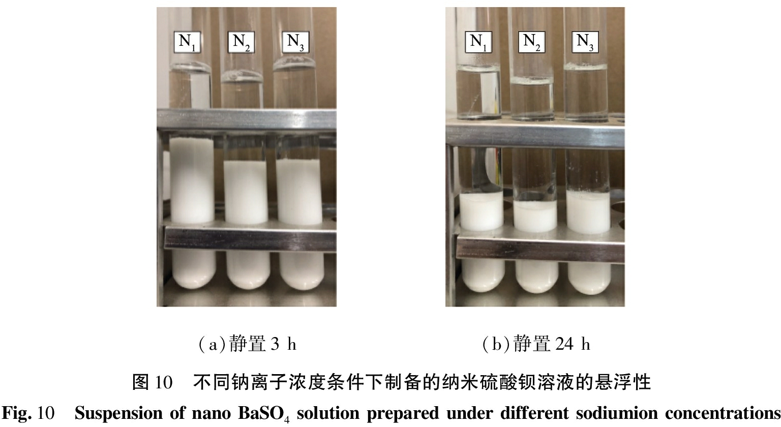 (a)静置3h(b)静置24h图10 不同钠离子浓度条件下制备的纳米硫酸钡溶液的悬浮性Fig.10 SuspensionofnanoBaSO4solutionpreparedunderdifferentsodiumionconcentrations