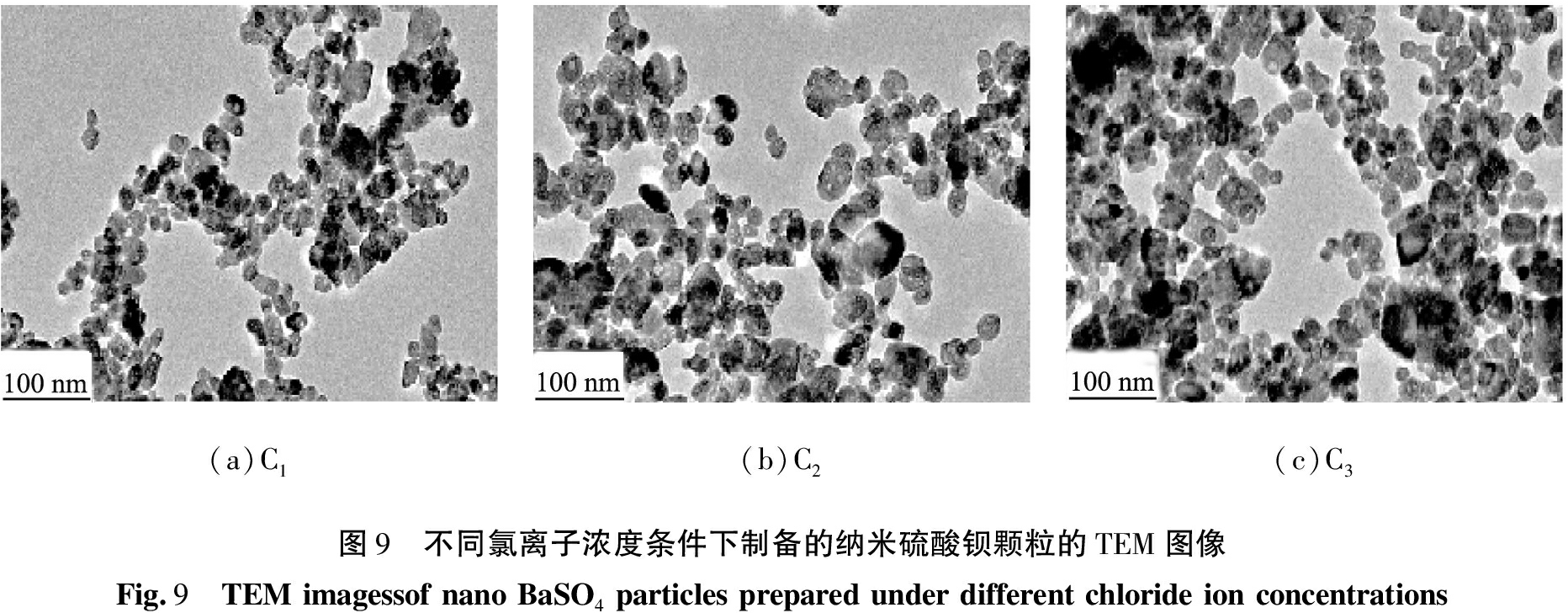 (a)C1(b)C2(c)C3图9 不同氯离子浓度条件下制备的纳米硫酸钡颗粒的TEM图像Fig.9 TEMimagessofnanoBaSO4particlespreparedunderdifferentchlorideionconcentrations