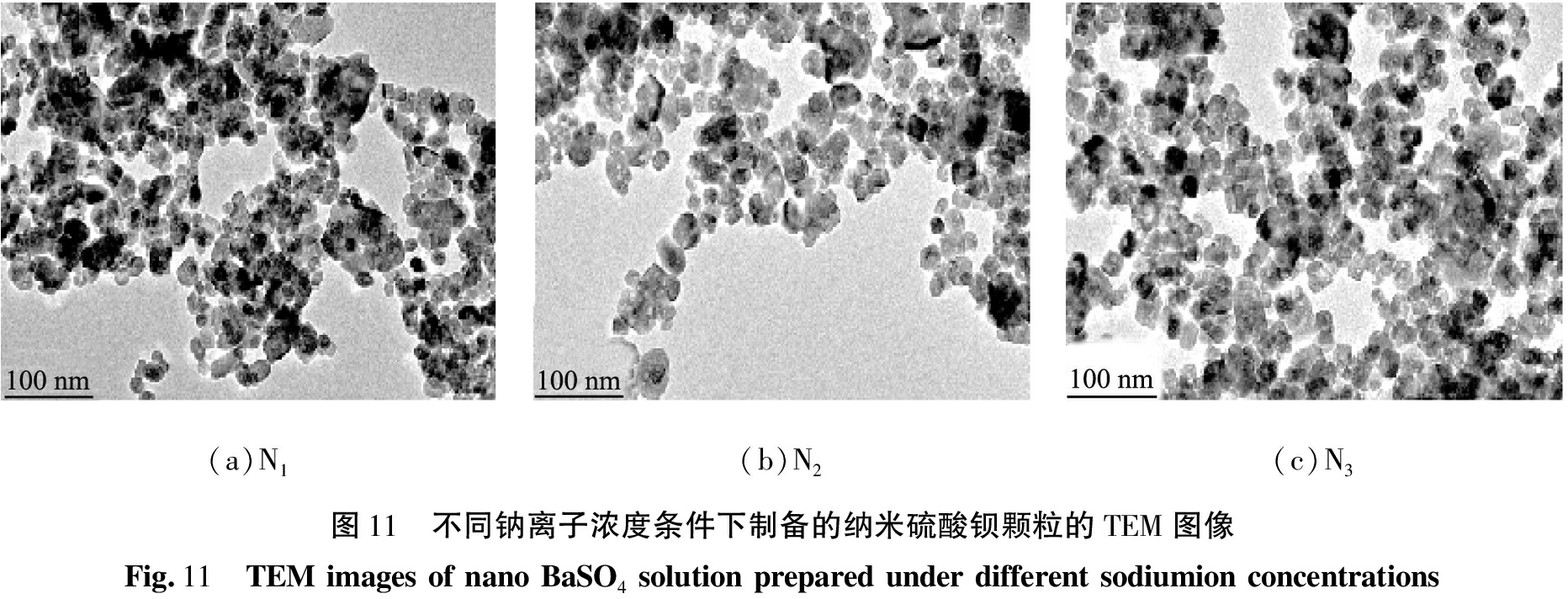 (a)N1(b)N2(c)N3图11 不同钠离子浓度条件下制备的纳米硫酸钡颗粒的TEM图像Fig.11 TEMimagesofnanoBaSO4solutionpreparedunderdifferentsodiumionconcentrations