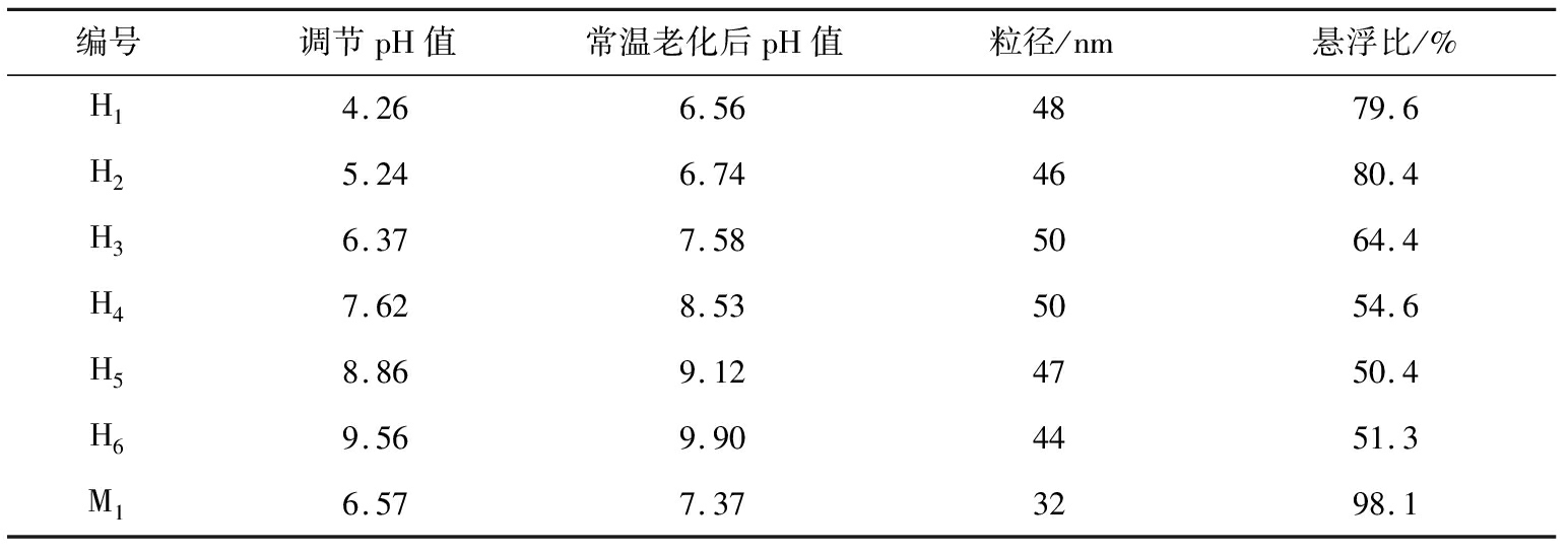 编号调节pH值常温老化后pH值粒径/nm悬浮比/%H14.266.564879.6H25.246.744680.4H36.377.585064.4H47.628.535054.6H58.869.124750.4H69.569.904451.3M16.577.373298.1