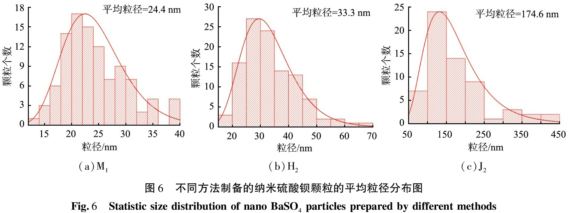 选取有代表性的3个样品M1、H2、J2,通过其TEM图像进行粒径统计,不同方法制备的纳米硫酸钡颗粒的平均粒径分布图如图6所示。由图可知,M1的统计平均粒径为(24.4±5.3)nm,粒径分布最窄;H2的为(33.3±9.1)nm,粒径分布仍较窄;J2的为(174.6±73.7)nm,粒径分布最宽。这足以证明膜分散微反应器的强化传质的特性,使反应原料溶液之间快速达到较为均匀的过饱和度,促进了更小且更均匀的硫酸钡颗粒的形成。