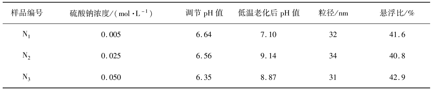 样品编号硫酸钠浓度/(mol·L-1)调节pH值低温老化后pH值粒径/nm悬浮比/%N10.0056.647.103241.6N20.0256.569.143440.8N30.0506.358.873142.9