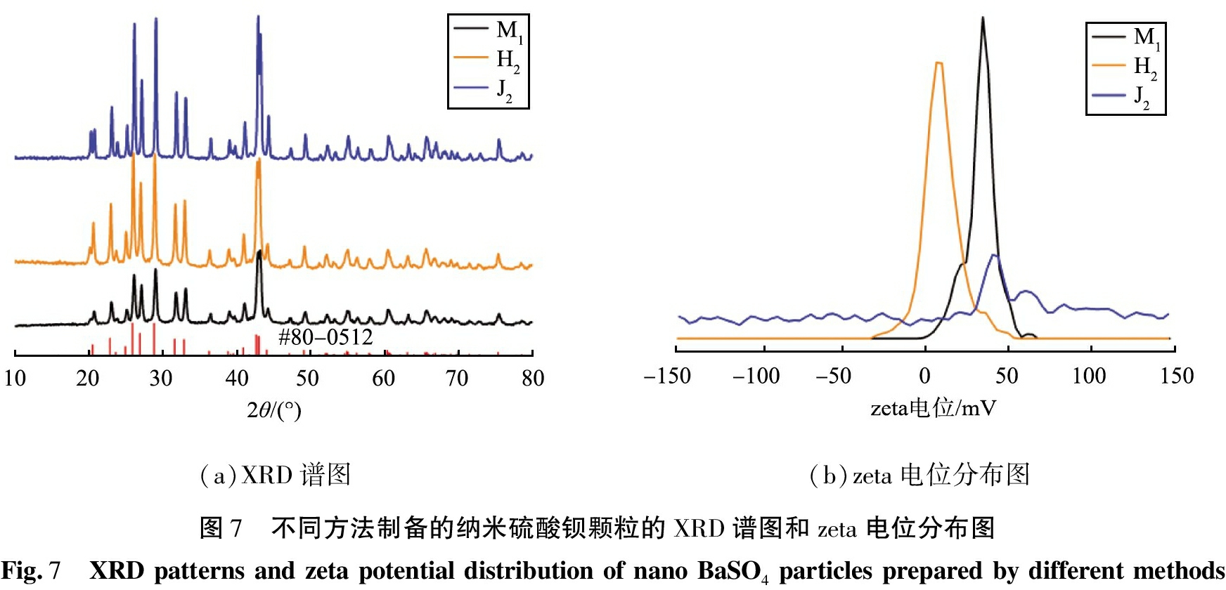 选取有代表性的3个样品M1、H2、J2进行测试,研究不同制备方法对所制备的纳米硫酸钡颗粒的XRD谱图和对zeta电位的影响。不同方法制备的纳米硫酸钡颗粒的XRD谱图和对zeta电位分布图如图7所示。