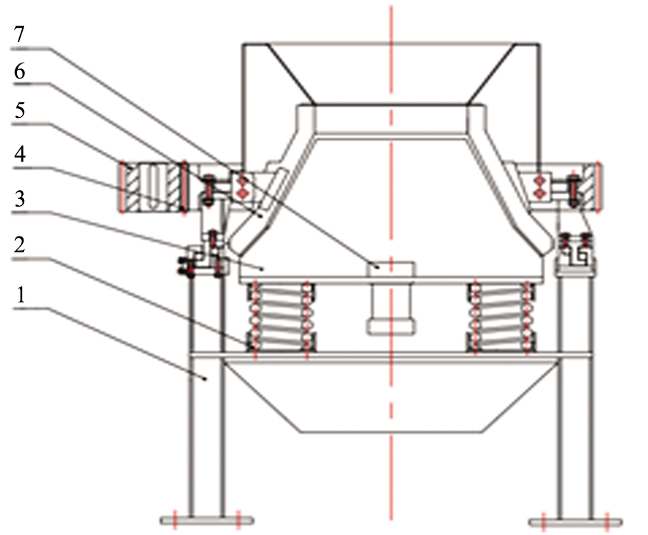 1—机架;2—主振弹簧;3—破碎机内锥;4—破碎机外锥齿轮;5—传动齿轮;6—破碎机外锥;7—立式激振器。
