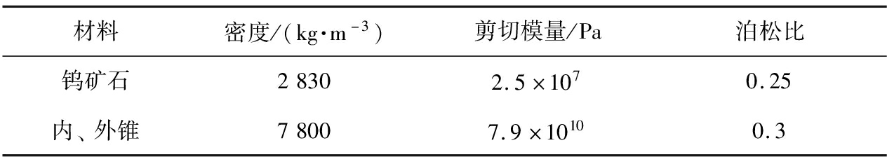 材料密度/(kg·m-3)剪切模量/Pa泊松比钨矿石28302.5×1070.25内、外锥78007.9×10100.3