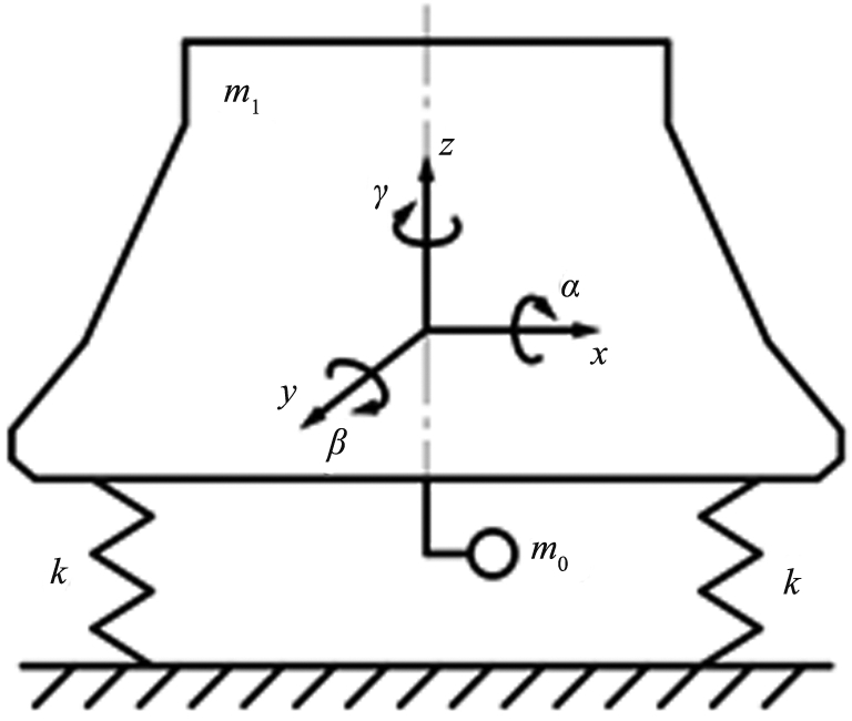 振动慢剪破碎机内锥的振动运动是一种非线性多自由度的振动系统,其运动形式十分复杂。内锥做空间自由运动,即在X、Y、Z方向的平动以及绕X、Y、Z方向的转动,共有6个自由度r。通过分析,振动慢剪破碎机内锥简化力学模型如图2所示,其中,m0是偏心块质量,m1是内锥质量,k是主振弹簧刚度,x、y、z为3个方向上的位移,α、β、γ为X、Y、Z方向上的转动角度。