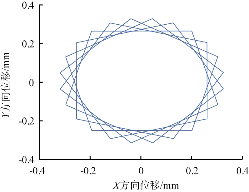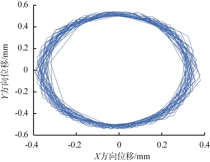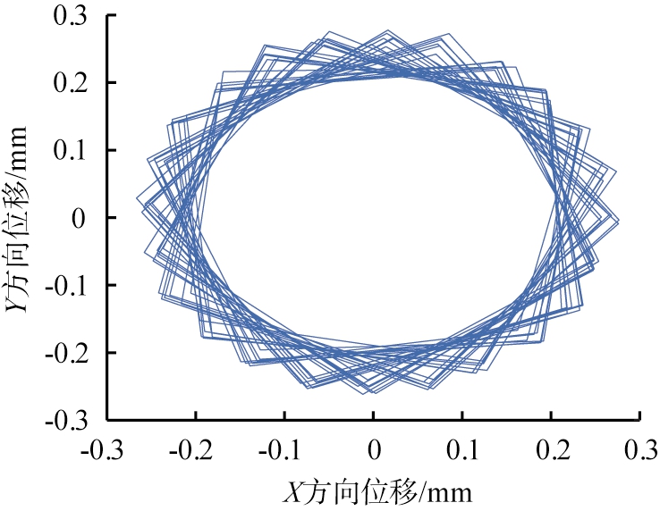 为探究振动慢剪破碎机在负载情况下的内锥运动情况,将破碎模拟结果通过ADAMS导出内锥质心MARKER点的X、Y方向位移数据,通过MATLAB数学处理软件,绘制内锥负载情况下在平面内的运动轨迹,如图8所示。分析图8可知,其内锥的主要运动为水平面上的振动圆运动,同时在负载的作用下,内锥在X、Y方向上的位移范围为-0.3~0.3 mm,整体振幅为0.6 mm,与空载情况下的X、Y方向上的位移范围为-0.4~0.4 mm,整体振幅为0.8 mm相比,振幅减小。