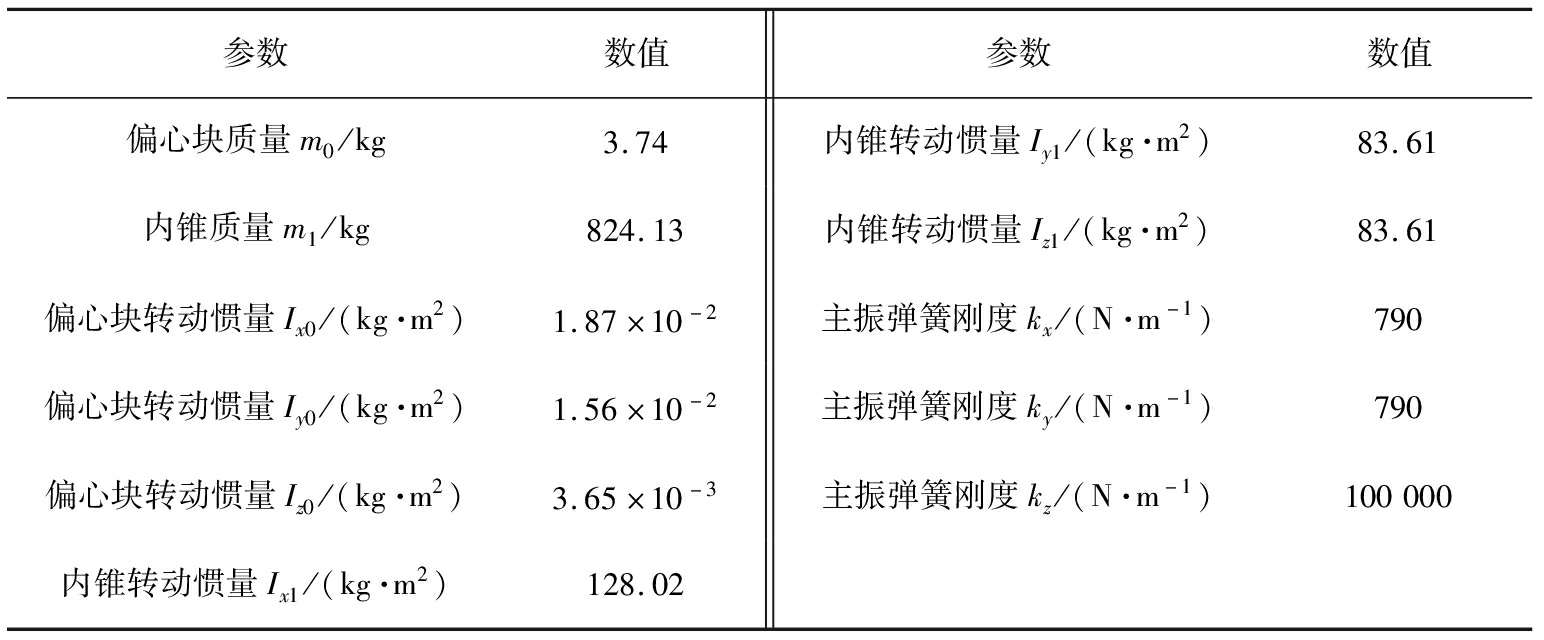 参数数值参数数值偏心块质量m0/kg3.74内锥转动惯量Iy1/(kg·m2)83.61内锥质量m1/kg824.13内锥转动惯量Iz1/(kg·m2)83.61偏心块转动惯量Ix0/(kg·m2)1.87×10-2主振弹簧刚度kx/(N·m-1)790偏心块转动惯量Iy0/(kg·m2)1.56×10-2主振弹簧刚度ky/(N·m-1)790偏心块转动惯量Iz0/(kg·m2)3.65×10-3主振弹簧刚度kz/(N·m-1)100000内锥转动惯量Ix1/(kg·m2)128.02