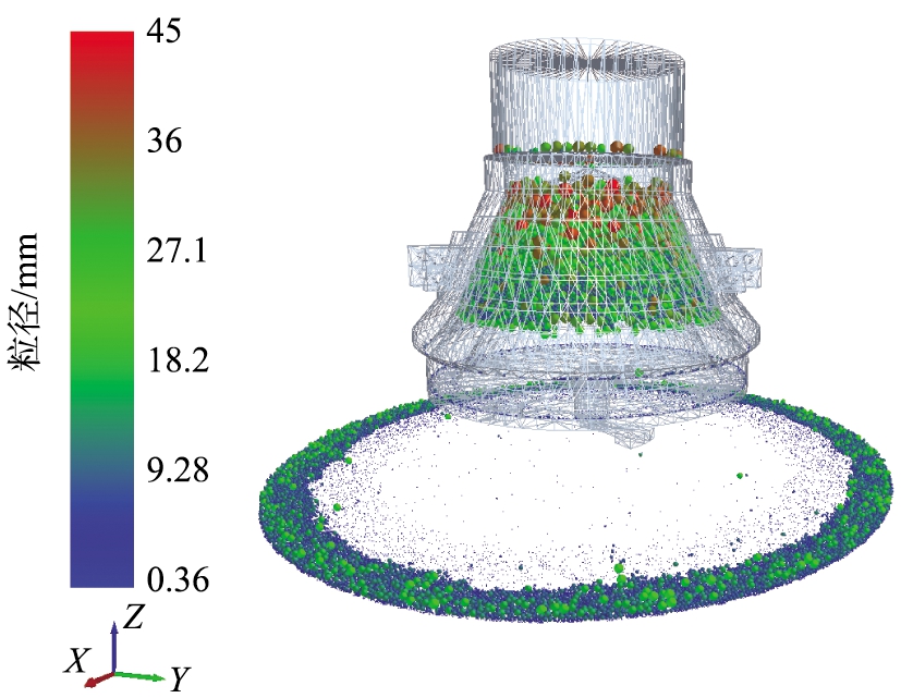 在EDEM后处理中的破碎仿真效果如图7所示,由图可知,矿石颗粒呈分层破碎,上部颗粒粒径较大,进入排料口区域的矿石颗粒较小,其中入料粒径为30~45 mm、排料粒径为0.36~18 mm,与实际破碎过程相符。