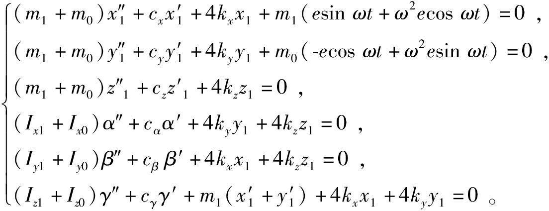 系统的广义干扰力为系统中的非理想约束的反力,即阻尼。将前文求得的系统动能、势能以及广义干扰力代入拉格朗日方程式(1)中,可以建立振动慢剪破碎机内锥6个自由度振动微分非线性方程组,通过进行相应的简化以及线性化处理[14-15],得到内锥六自由度振动微分方程组: