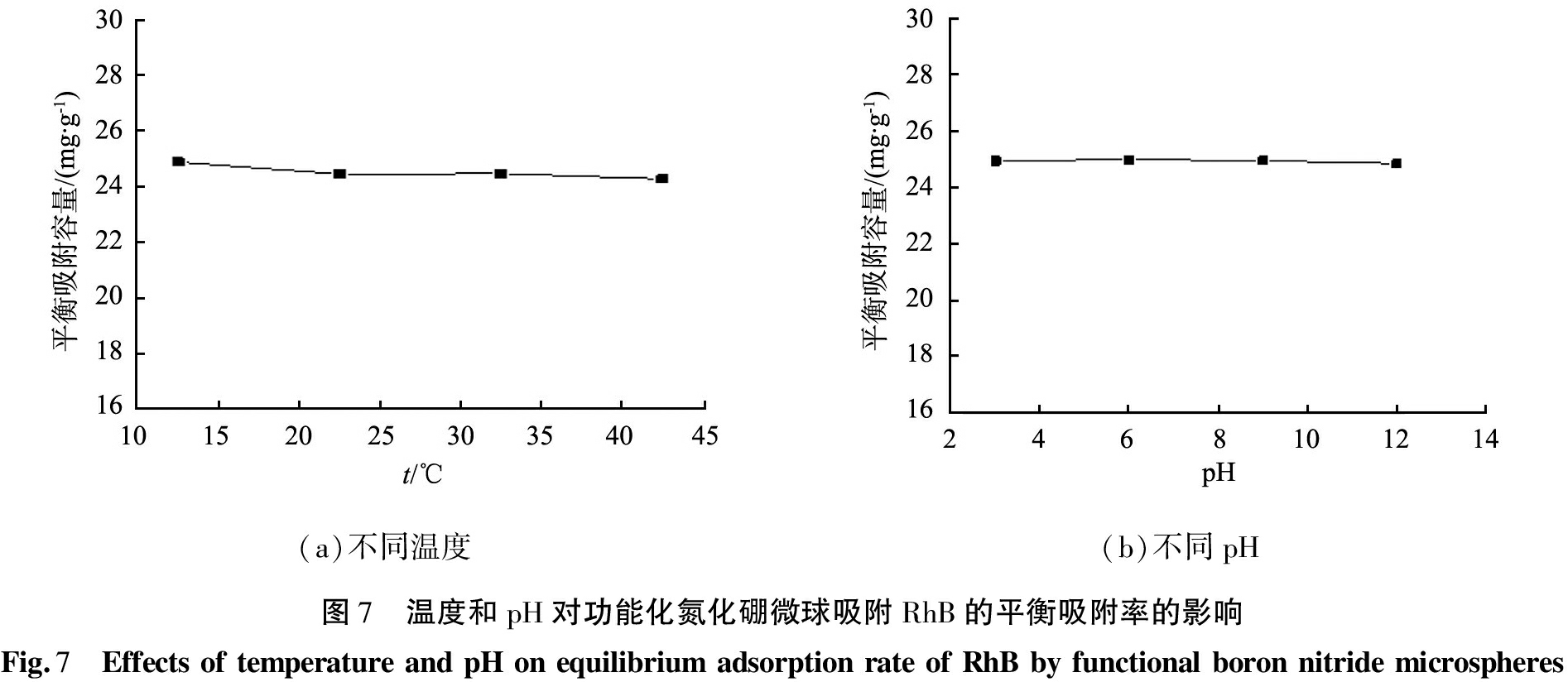 2)温度和pH影响。图7所示为温度和pH对功能化氮化硼微球吸附RhB的影响。由图7(a)可以看出,温度从15 ℃升高到45 ℃时,平衡吸附容量变化不大,均在24 mg/g左右。同时,由图7(b)可以看出,随着pH从3变化至12,功能化氮化硼微球吸附RhB的平衡吸附容量也基本不变,均维持在25 mg/g左右。综上结果可得,功能化氮化硼微球吸附RhB在实验范围内不受温度和pH的影响,因此在实际使用功能化氮化硼微球作为吸附剂时,不需要特别关注溶液的温度和pH。