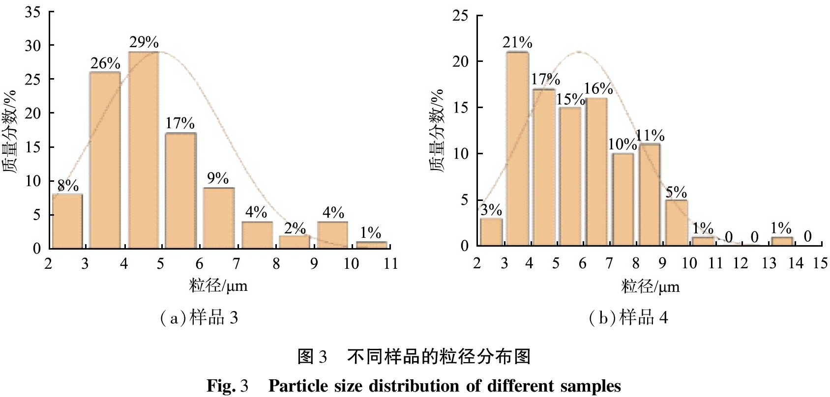 (a)样品3(b)样品4图3 不同样品的粒径分布图Fig.3 Particlesizedistributionofdifferentsamples
