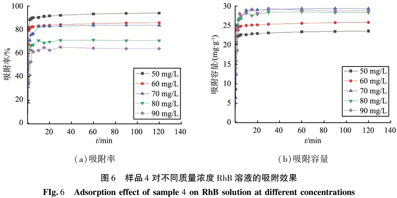 1)罗丹明B的质量浓度。图6所示为样品4对不同初始质量浓度的RhB溶液的吸附效果。如图可知,样品4对溶液中RhB的吸附速率很快,在5 min内均可达到吸附平衡。当吸附时间相同时,随着RhB溶液质量浓度的增加,样品4对RhB的吸附率逐渐下降,吸附容量上升至70 mg/L时达到最大值。RhB溶液的质量浓度为50、60、70 mg/L时,平衡去除率在80%以上,其中质量浓度为50 mg/L的RhB溶液的平衡去除率在90% 以上。结合图5还可以看出,达到吸附平衡的时间几乎不随RhB溶液的浓度的改变而变化。