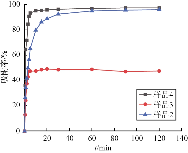 图5所示为不同样品对RhB溶液的吸附效果对比图。从图中可以看出,相同实验条件下,样品3、4在短时间内均可达到吸附平衡,但样品3的平衡吸附率远低于样品4的,这是因为由BNNSs组合的多孔微球结构的功能化氮化硼微球的粒径分布、平均直径和比表面积上比样品3的均有明显提高,且大孔结构更利于RhB的分子吸附。样品2、4的平衡吸附率都较高,样品4的吸附速率更快,在5 min内的吸附率可达到95%以上,原因是功能化氮化硼微球比表面积稍高于BNNSs的,并且微球中形成了疏松大孔道结构,利于RhB分子在内部快速扩散,提高了吸附效率[10]。综上可知,在相同条件下实验制备的功能化氮化硼微球对RhB的吸附容量和吸附速率均优于未煅烧的样品和BNNSs的。