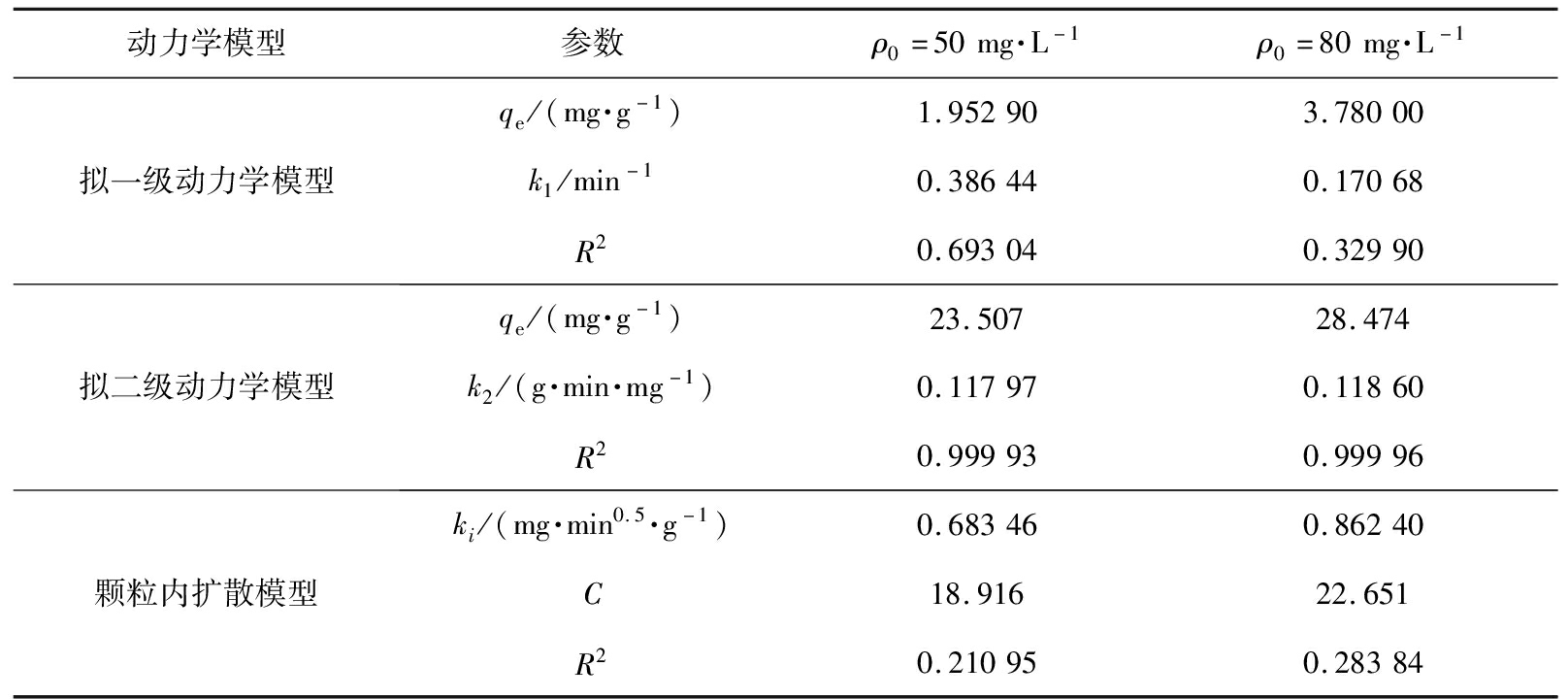 动力学模型参数ρ0=50mg·L-1ρ0=80mg·L-1拟一级动力学模型qe/(mg·g-1)1.952903.78000k1/min-10.386440.17068R20.693040.32990拟二级动力学模型qe/(mg·g-1)23.50728.474k2/(g·min·mg-1)0.117970.11860R20.999930.99996颗粒内扩散模型ki/(mg·min0.5·g-1)0.683460.86240C18.91622.651R20.210950.28384