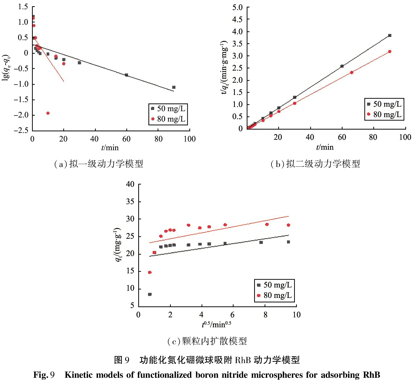 图9所示为分别对初始质量浓度为50、80 mg/L的RhB溶液,利用3种模型拟合的吸附动力学曲线,模型参数数据见表2。其中,二者初始质量浓度下的吸附均是拟二级动力学模型的R2值最高,因此功能化氮化硼微球吸附RhB的过程可以用拟二级动力学模型来解释,即速率限制步骤是化学吸附过程。