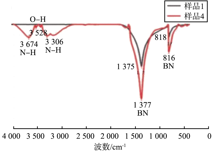 图4所示为样品1、4的红外光谱图。由图中可以看出,样品1、4在1 400、800 cm-1处有较强的特征峰,对应h-BN典型伸缩振动和弯曲振动。同时,样品4在3 435、3 527 cm-1处多出了 O—H 单键的伸缩振动峰,说明样品剥离时成功接枝了羟基,而在3 298、3 674 cm-1处可以推断为N—H单键的伸缩振动峰,则球磨时易分解铵盐成功为h-BN接枝上氨基。