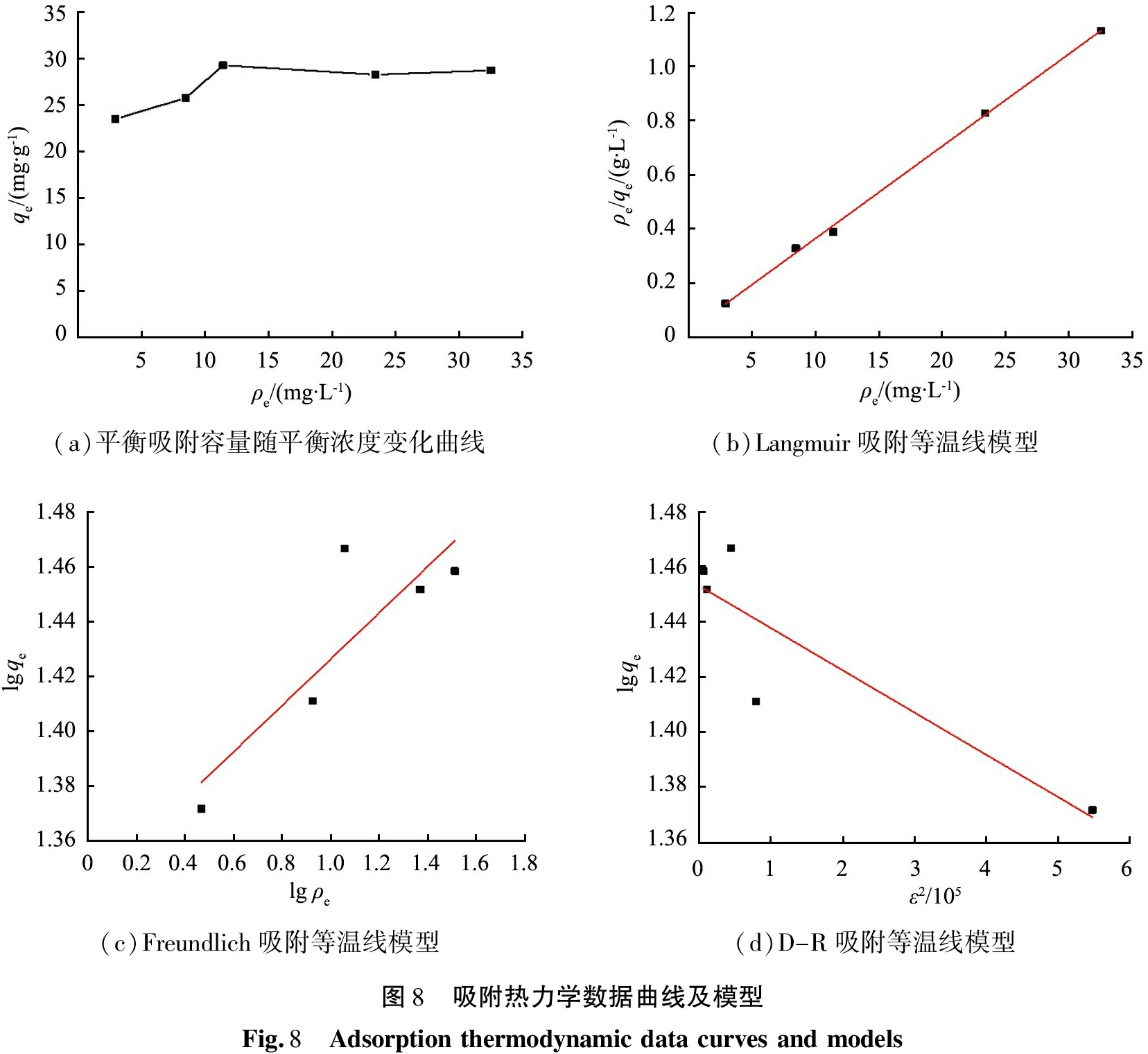 1)吸附热力学。吸附等温线用于描述吸附剂的吸附能力以及与被吸附物之间相互作用机理,本文中采用Langmuir吸附模型、Freundlich吸附模型、Dubinin Radushkevich(D-R)吸附模型对吸附平衡数据进行了分析,拟合方程[16]如下。