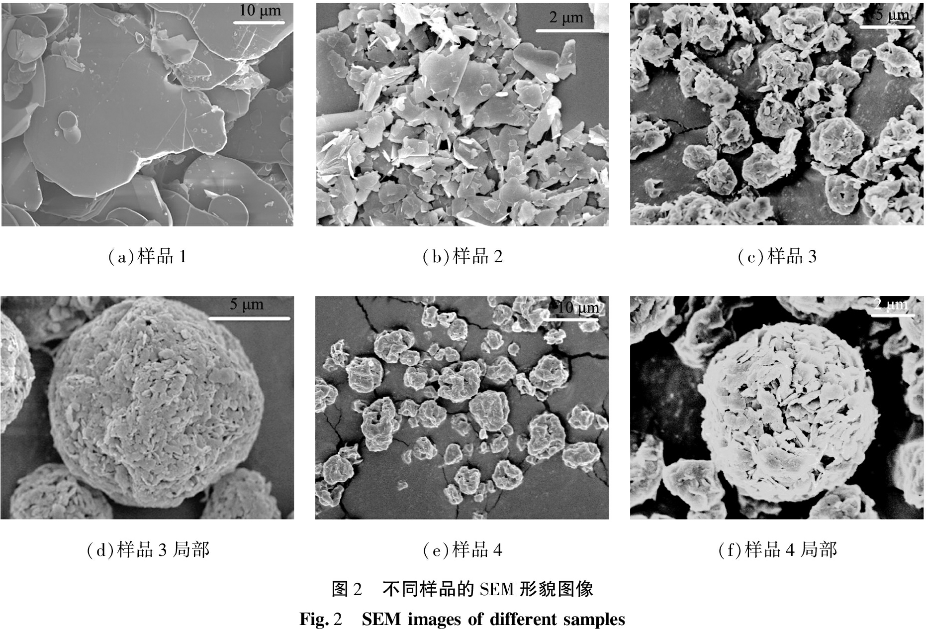 (a)样品1(b)样品2(c)样品3(d)样品3局部(e)样品4(f)样品4局部图2 不同样品的SEM形貌图像Fig.2 SEMimagesofdifferentsamples