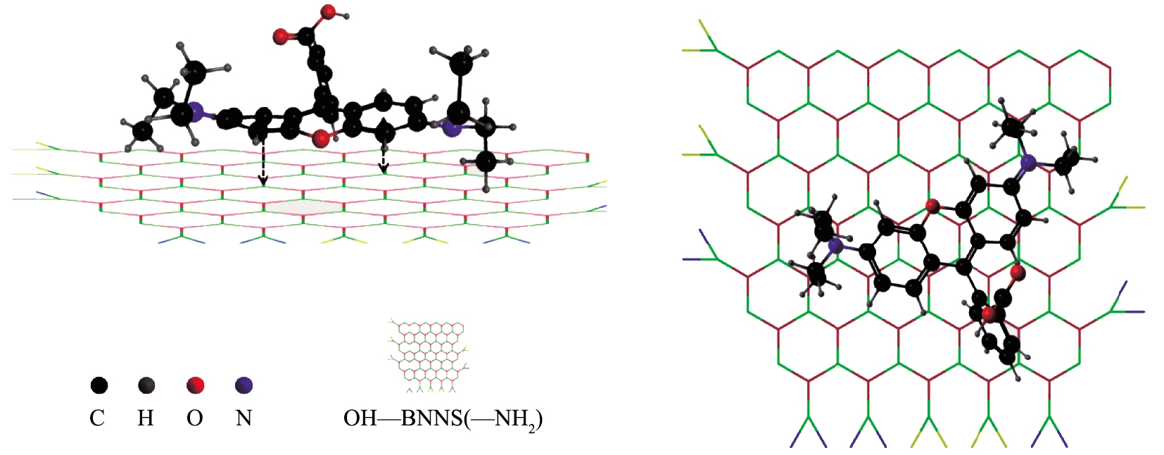 综上,功能化氮化硼微球吸附RhB为单分子层化学吸附,且结合该过程基本不受pH的影响。本文中合成的功能化氮化硼微球组成结构BNNSs具有由B和N交替环合的六元环结构,该结构中的B原子可以接受π电子。吸附质RhB结构中含3个芳香苯环,富含π电子,因此,认为功能化氮化硼微球吸附RhB主要受到π-π相互作用[19],机理如图10所示。同时,功能化氮化硼微球中接枝的亲水性官能团对于吸附RhB也可能产生积极的影响。