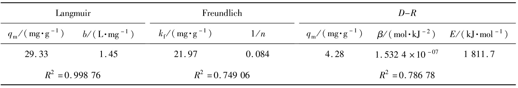 表1 Langmuir、Freundlich、D-R模型参数
